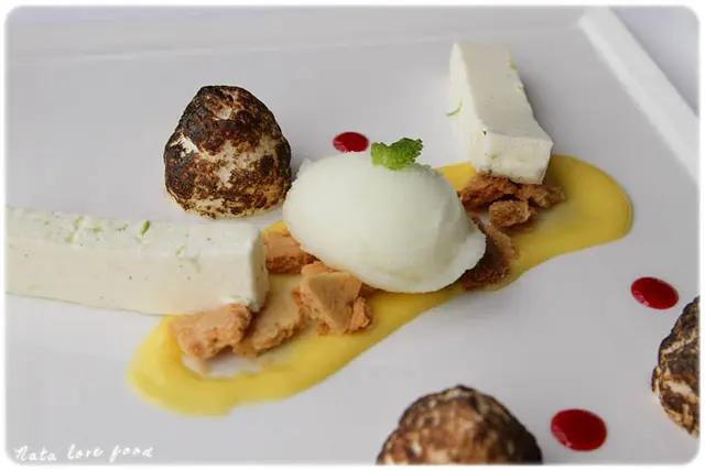 爽甜好吃的長條慕司雪酪、酸甜清新的檸檬冰砂、酥酥脆脆的餅乾脆片、濃郁滑順的檸檬醬等都非常好吃,這甜點有水準!不過,我不太喜歡旁邊附的炙烤蛋白霜,烤得太黑吃起來都是焦味,所以,我只吃一個剩下的就放棄了。
