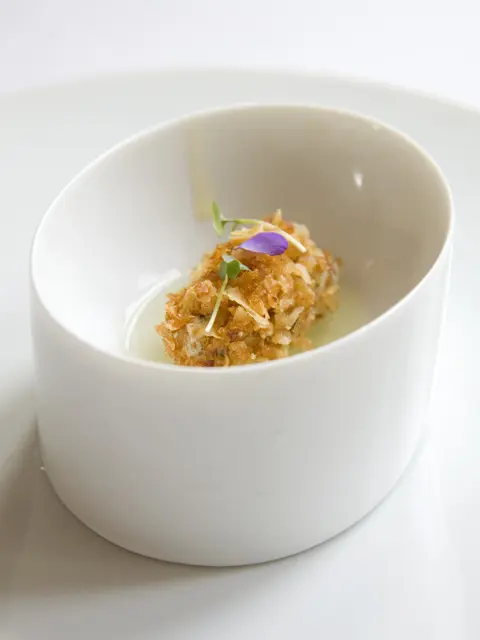 主要食材為鯛魚,上面撒著香酥的蒜片,最底下有可平衡味道的淡雅湯凍 -