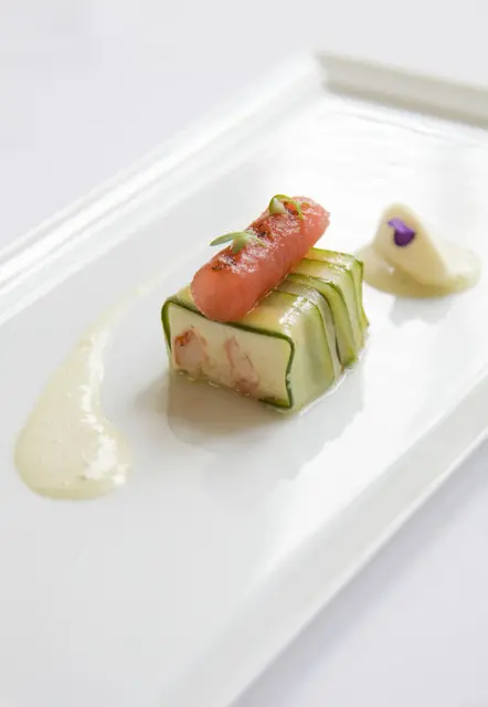 薄薄的小黃瓜片包覆著龍蝦慕絲,上頭放有炙烤過的西瓜,旁邊的佐醬我是真想不起來了 -