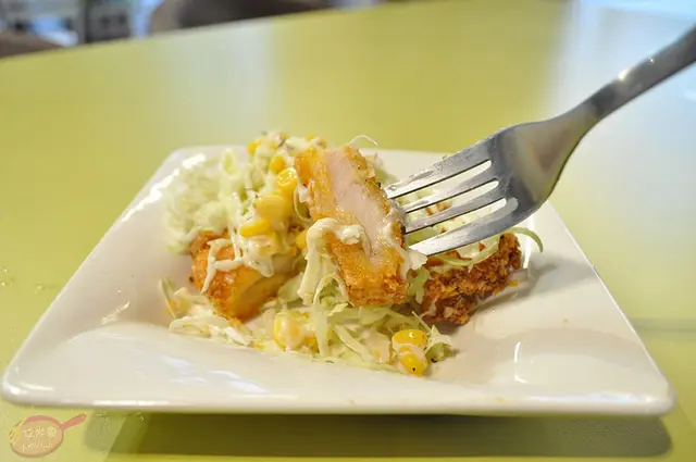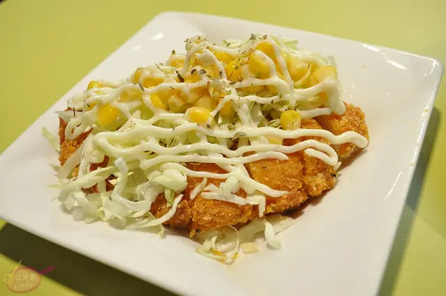 現炸香酥無骨雞排加上生高麗菜絲、甜玉米粒、沙拉醬、香草粉..