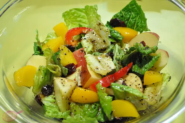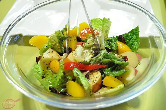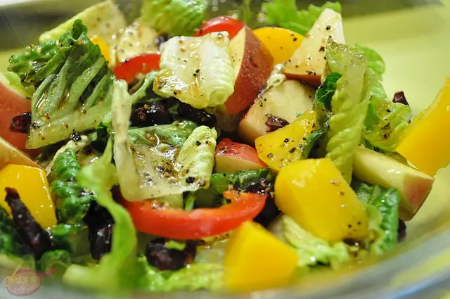 生菜葉、彩椒丁、蘋果丁、水蜜桃丁..拌上特製初榨橄欖油與葡萄醋調的油醋汁