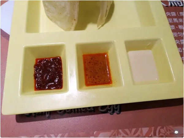 由左至右分別為參巴醬、咖哩醬、煉乳。