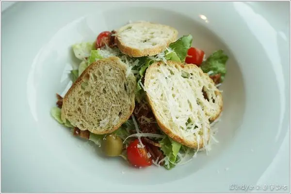 凱撒沙拉 灑上的培根脆、綠橄欖、現刨起士