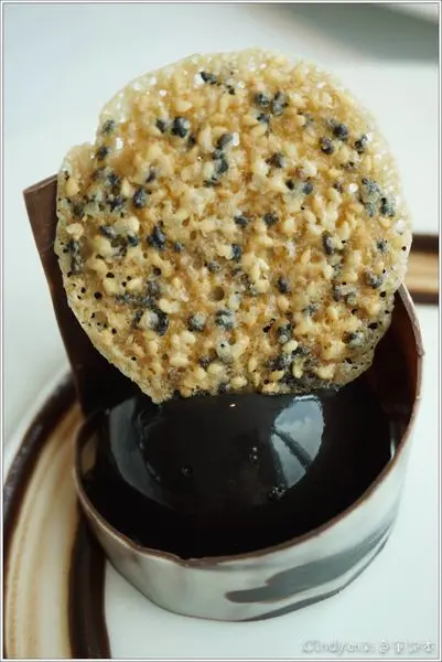 裡面是巧克力與草莓慕斯 上面的芝麻脆餅香脆好吃