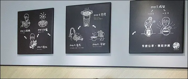 另一邊的牆面用可愛的漫畫呈現天然仙草從種植、採收、日曬、清洗、熬煮、冷卻、到製作成商品的過程