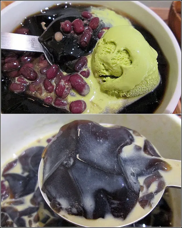 天然膠質軟嫩綿滑的嫩仙草,味道清香有青草茶的味道,加上紅豆與抹茶冰淇淋後甜度剛好