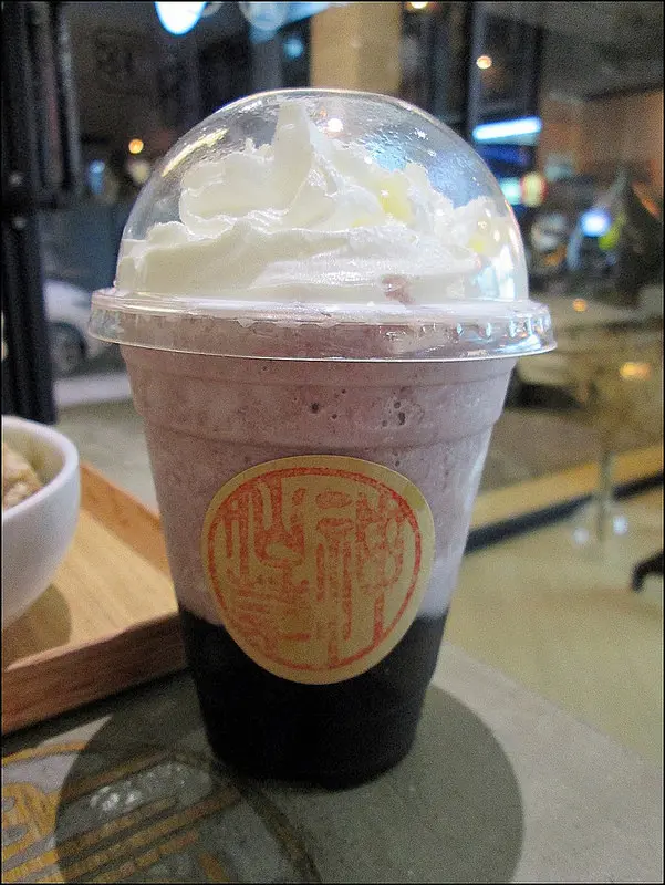 紅豆慕昔底層是嫩仙草、中間則是把熬煮好的蜜紅豆加鮮奶打成奶昔狀、最上層再擠上奶泡