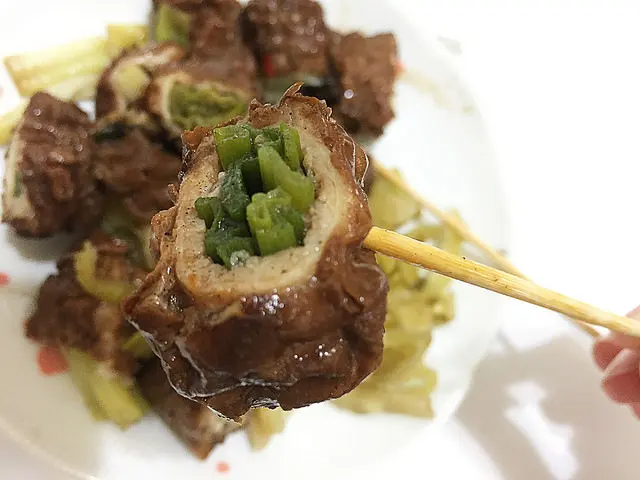 軟嫩的大腸夾上香噴噴的蔥段,增添香味,越嚼越香
