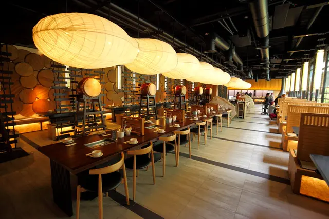 昭日堂鍋煮的用餐環境,承襲著一貫的日式簡約風格,最吸睛的還是中間那排以雲朵為設計意象的吊燈