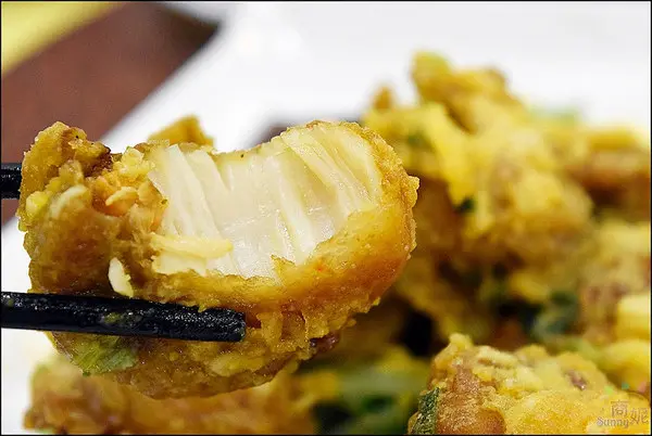 帆立貝大顆水份飽滿,外酥內嫩多汁本身就好吃