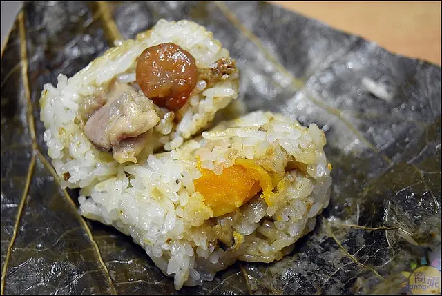 咬開糯米雞,裡頭的料有鹹蛋黃、香菇、蝦仁、雞肉、還有豬絞肉