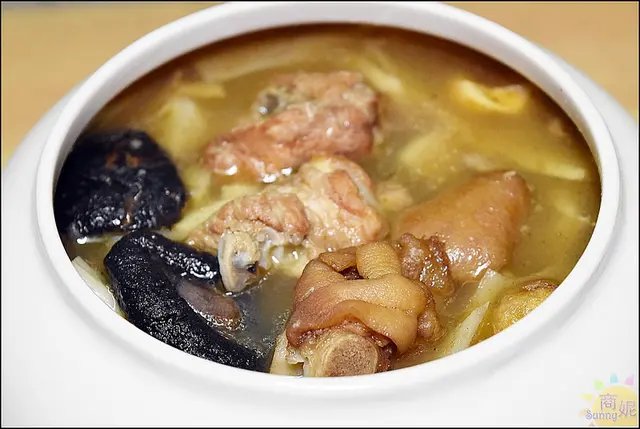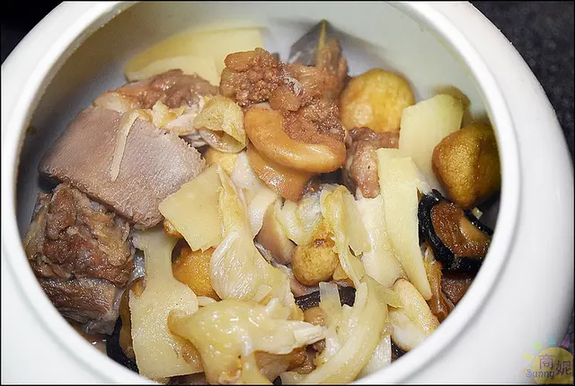三節翅雞肉、排骨肉、豬腳丁、桂花翅、芋頭、花菇、栗子、鳥蛋、筍片