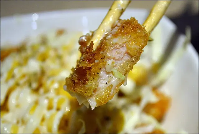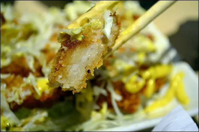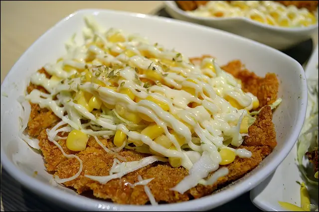 上面淋上美乃滋、高麗菜絲、玉米粒,日式風味吃起來一點都不油膩,好好吃~~