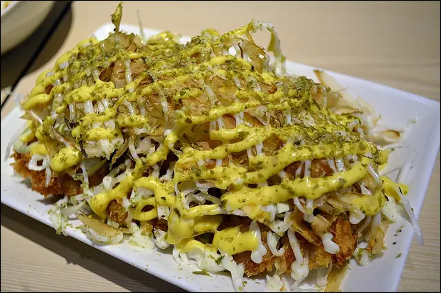 大阪燒豬排跟日式雞排有點像,差別是多淋上芥末醬,還有加入大量的柴魚片