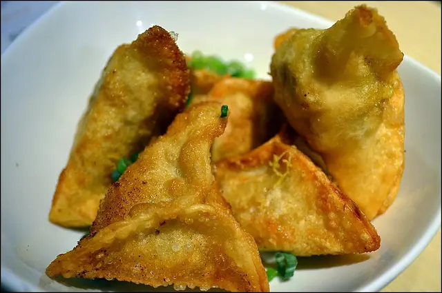 這一道餃子燒非常特別,外皮是炸到起泡的水餃皮,口感非常香酥
