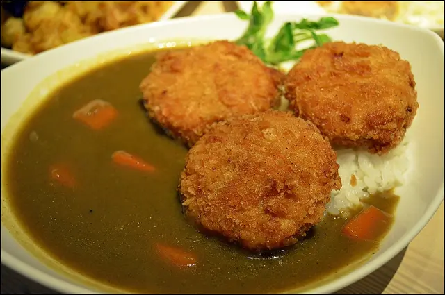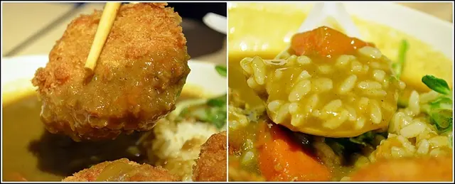 可樂餅沾了咖哩醬後跟前面的乾吃口感不太一樣,多了咖哩微微的辣