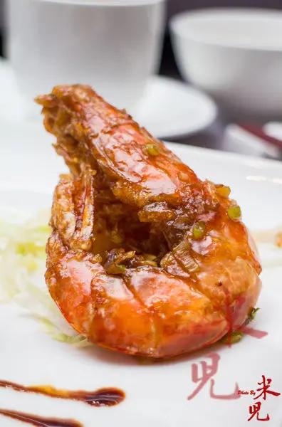 乾煎明蝦,炸過的大蝦以醬油調的醬汁入味,做好的蝦連蝦殼都可以直接吃下肚,醬汁鹹中帶甜,引出蝦肉美味。