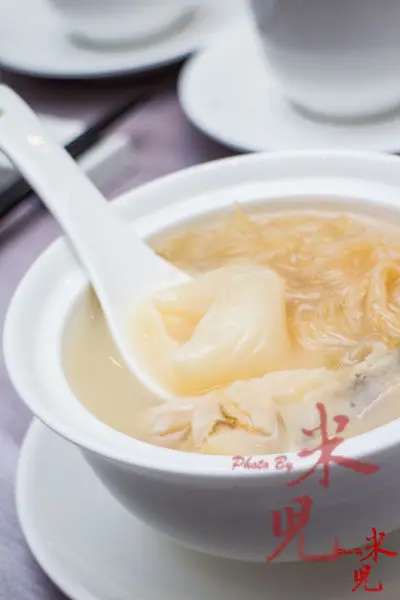 濃湯花膠魚翅,乳白色的湯頭說明了濃郁的口感,裡頭的料多而矜貴,有花膠、魚翅、干貝等好料,所有鮮味共冶一爐,真是讓人意猶未盡!