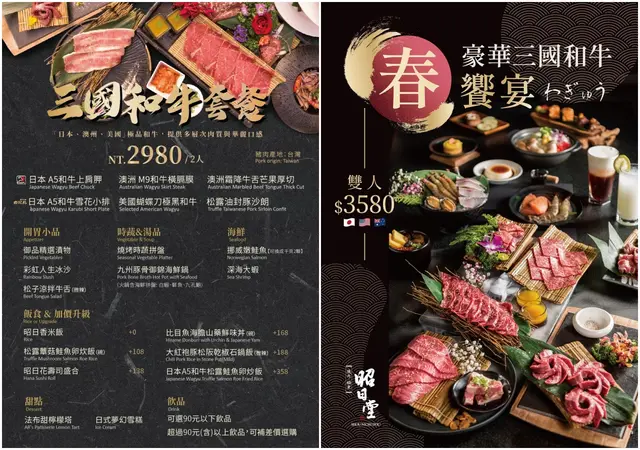 台中燒肉推薦這間昭日堂燒肉,昭日堂總是不會讓人失望,昭日堂之前剛開幕曾經吃過昭日堂鍋煮,第一次看到昭日堂的店門外觀跟環境,一整個就是霸氣到一個不行,當時就有注意到一樓的昭日堂燒肉,心裡想說如果有機會一定要來試試看,結果一直擺在口袋名單裡沒來,前一陣子昭日堂燒肉推出全新套餐『三國和牛套餐』,整套包含美日澳三國和牛、外加海鮮火鍋、飲料、甜點等,CP值堪稱有史起來最高,此時不吃更待何時!