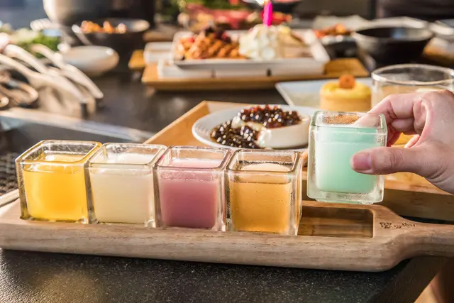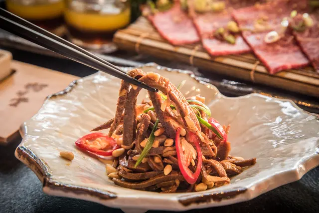 開胃小品:御品泡菜、彩虹人生冰沙、松子涼拌牛舌,昭日堂泡菜吃起來酸甜微辣,口感也很脆,但不要一次吃光,留一點可以配肉吃,彩虹人生冰沙顏色超繽紛,紅橙黃綠藍紫,口味分別為百香果、水蜜桃、葡萄、青梅、藍柑橘,冰冰涼涼的挺開胃,松子涼拌牛舌上桌是已經料理好了可以直接吃,切成條狀的牛舌口感相當紮實,咀嚼時能感受到辣辣的味道,相當特別!