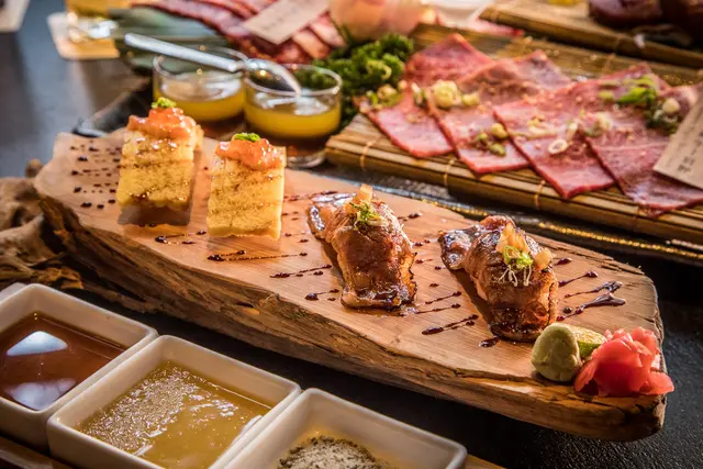 主餐肉品,直接切入重點,豪華三國和牛饗宴可以說是把日美澳三國經典和牛通通來個大集合!且會根據不同的牛肉來選擇搭配不同的調味料,這點真的算是很用心,而且擺盤真的超華麗的啦,先從日本A5和牛上肩胛吃起吧
