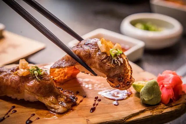 握壽司:炙燒日本A5和牛握壽司及炙燒鮭魚卵玉子燒握壽司,選用日本A5和牛,經過炙燒搭配醋飯製作成和牛握壽司,能夠品嚐到和牛濃郁的香氣及柔嫩口感,炙燒鮭魚卵玉子燒握壽司也很不錯,玉子燒軟嫩嫩還有高湯甜鮮再加上濃鮮鮭魚卵,奢華感十足