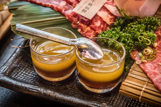 日本A5和牛上肩胛是切成薄片,下爐烤速度咬要很快,大概半面出水就可以翻面了,吃的時候先吃原味,品嚐和牛入口即化的口感,第二種吃法是搭配附贈的青梅凍一起包著吃,靠著清爽的酸脆,來平衡和牛的油膩感,也很特別