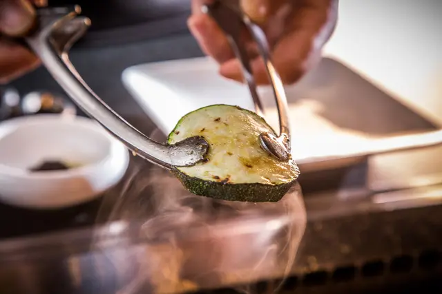 橙香壺漬和牛角切,和牛切成厚條狀,加入主廚特製橙香醬汁壺漬,還沒烤光聞就隱約有柑橘味的香氣