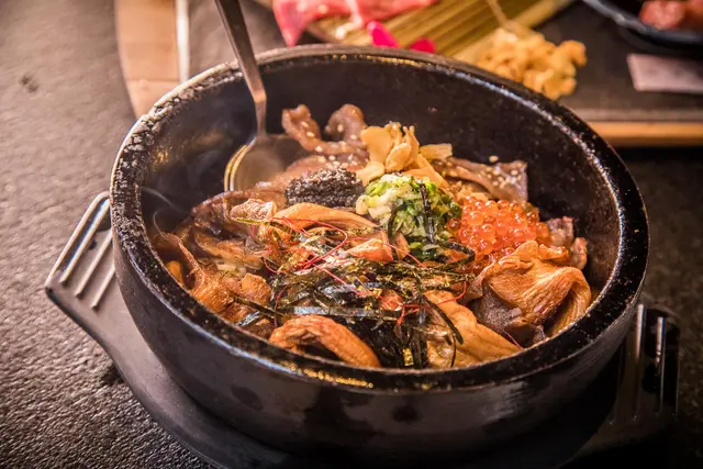 白飯換購加價$358:日本A5和牛松露鮭魚卵炒飯,這個必須要加點,有夠好吃啦,炒飯是用石鍋裝,吃的時候要跟石鍋拌飯一樣拌料,裡面有日本A5和牛肉片、松露跟大量的鮭魚卵,拌的時候超香啦