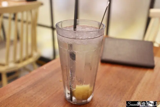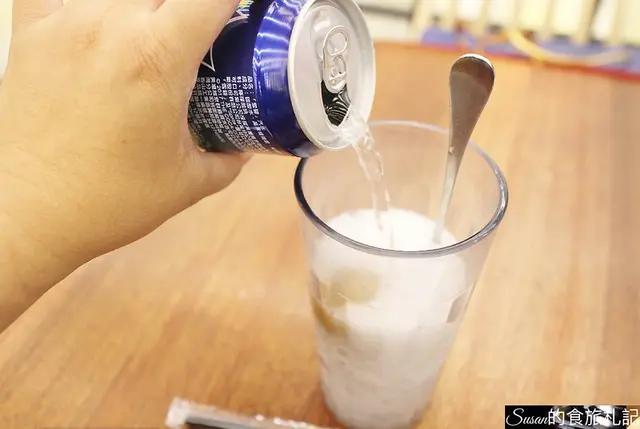 先把鹹檸檬戳一戳讓鹹檸檬出味道,再把汽水倒進去