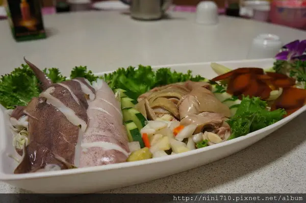 婆婆這次預約了5000元一桌的菜色,我覺得蠻豐富的耶!這個冷盤的三道菜我都喜歡,終於不是生魚片,YA~有軟絲(可惜口感不夠甜,所以剩很多)好吃的油雞跟烏魚子,旁邊的泡菜也很美味,有台南味的泡菜