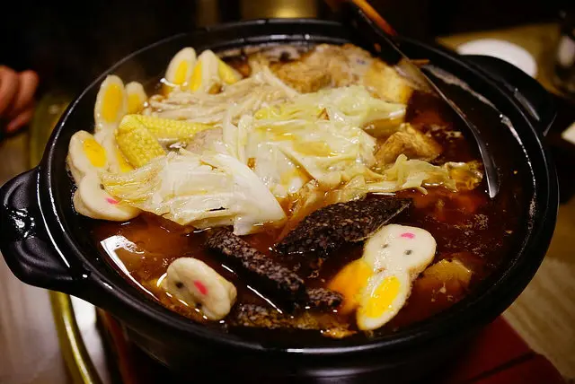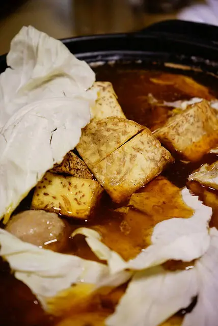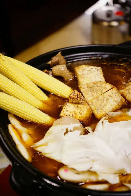 看到工作人員拿了一大堆甘蔗走過去才知道這裡的薑母鴨湯頭是用甘蔗去熬煮的,還有多種中藥材,但吃起來很香甜溫和,沒有重重的藥材味和酒味,撥掉上層厚厚的油脂後,隨之而來的是帶著薑母辛辣味的清甜湯頭,越煮越甜,就連芋頭也融入了薑母鴨的甜美,然後整個入口即化在我嘴裡,火鍋就是要搭芋頭啊!