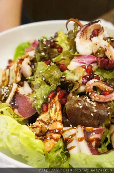 每次來必點的海鮮蔬菜沙拉,都會搭配當令季節的鮮美食蔬,所以這兩盤看起來不大一樣,上次的有加上紅石榴,而這次的沒有,醬汁好像也有略略不同,不過都是微酸且輕爽開胃的水果系列醬汁,這一盤份量很大,我們兩個幾乎每次都吃不完,唯一一點點美中不足的地方就是感覺吃到最後醬汁好像都會不太夠,吃到最後的生菜都比較沒有味道