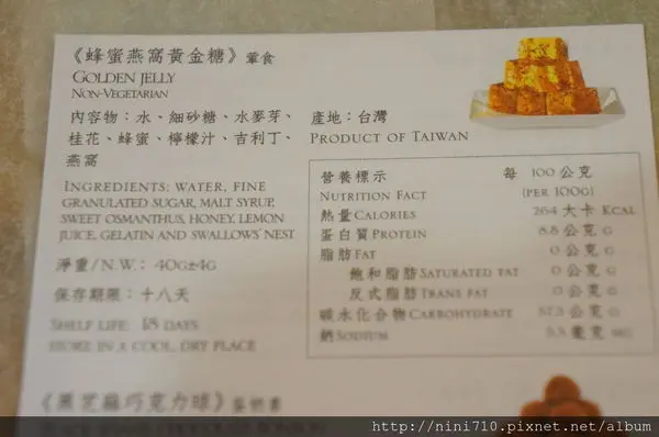 蜂蜜燕窩黃金糖用富麗堂皇的黃金紙包裹起來,一打開包裝紙就聞的到甜膩的蜂蜜氣息,輕輕壓他是軟Q有彈性的,看起來像果凍吃起來則比較偏像是軟糖,雖然是糖果卻可以做到香甜而不膩口,一次吃他個兩三顆不是問題,問題就是貴了點,小小一盒就快要800元了,所以我要節省一點吃,而且保存期限只有18天,好短啊!真的是貴婦等級的甜點