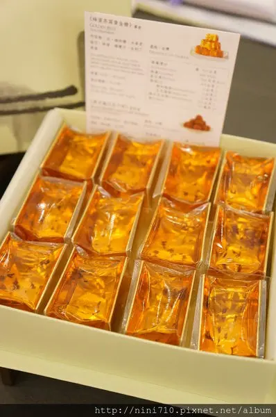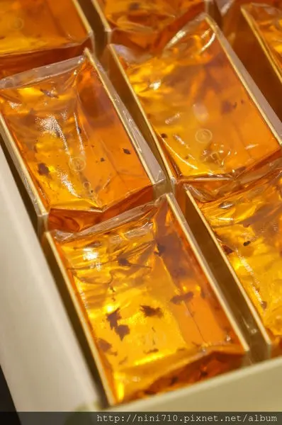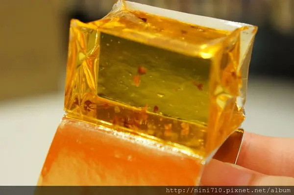 黃澄澄晶瑩剔透的感覺,就像一塊琥珀蜜蠟一樣的吸引我的眼光,讓我實在很好奇到底嚐起來是甚麼樣子的口感?