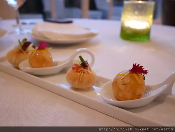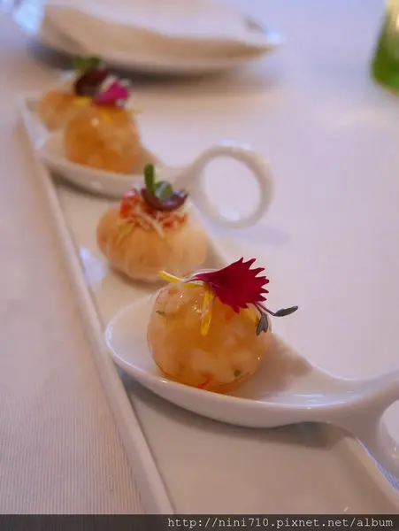 一顆顆晶瑩剔透的開胃小點,宛如寶石般美麗的讓人捨不得吃他,前面這顆是海鮮球凍,一口咬下鮮甜滋味在嘴裡綻放開來,濃縮了整個海之味