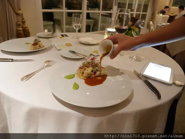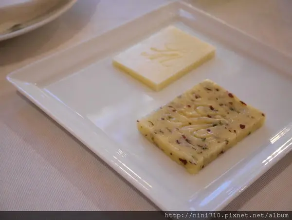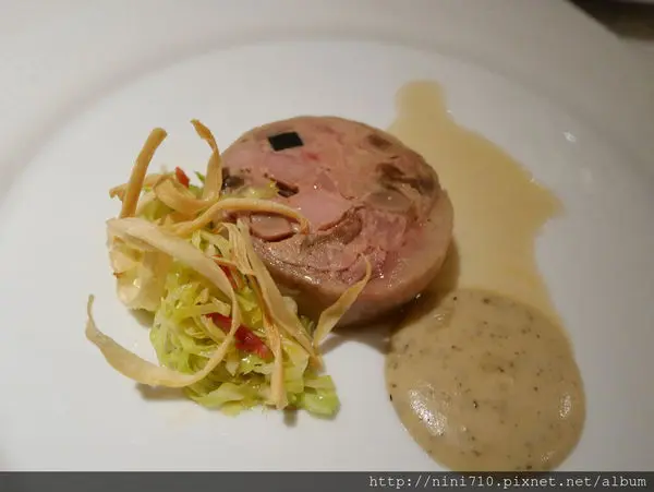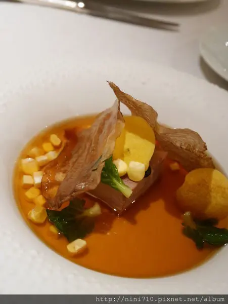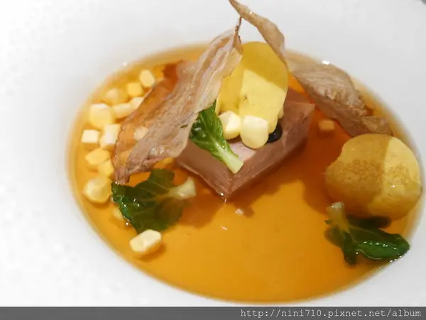 開胃菜,用新鮮的鴨肝去做成的慕斯,小小巧巧的,上頭是馬鈴薯與檸檬作成薄透的片狀,咬起來好輕脆