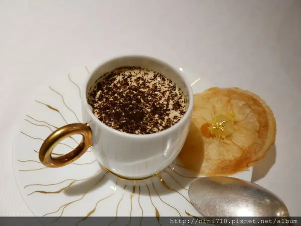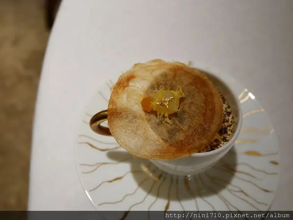 吃起來像甜點的開胃菜,要將馬鈴薯片搗碎一起混入享用,有點像咖啡酒布丁軟滑香甜的口感,原來是加了Espresso與來自義大利西西里島的瑪薩拉酒(Marsala wine),瑪薩拉酒本身有種強烈厚實的甜,這道開胃菜特殊又別緻,又有酒香與淡淡隱藏在其中的鴨肝獨有味,我超愛,前兩道開胃小菜就讓我整個上天堂,開始期待接下來會端出怎樣讓人驚訝的美食