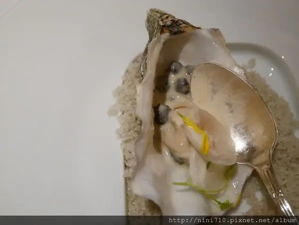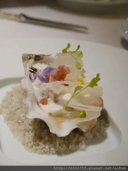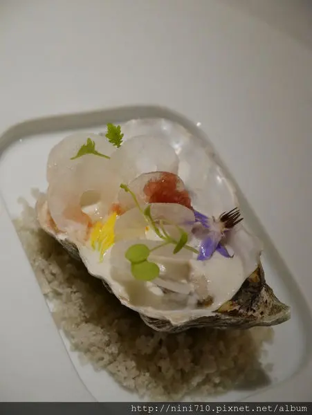 將食用花入菜實在是一個很美的主意,讓原本灰噗噗毫無顏色的生蠔好像披上春天的花園,來自法國輕脆爽口的吉拉朵生蠔,可以感受到柔和的海潮味,鮮甜再融入淡淡的乳香,上頭的白蘿蔔很像在花叢中飛舞的白粉蝶