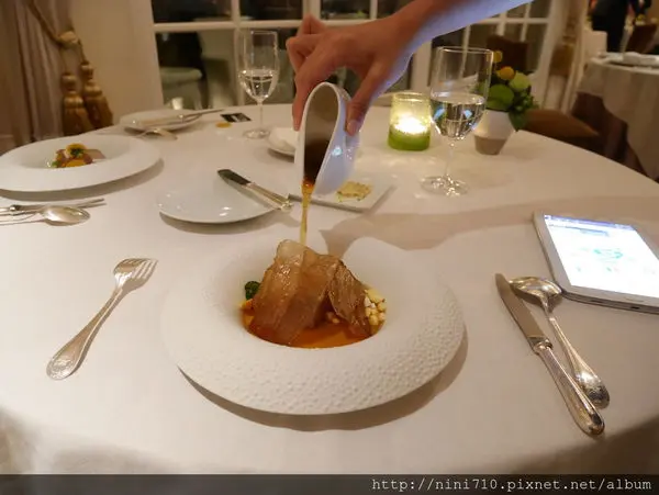 今天的料理當中我比較不敢吃的大概是這個台東古早小母雞肉捲,因為味道是我怕怕的那種腥味,雖然裡頭也有我愛的鴨肝與黑松露,但我還是很怕那個味跟肥肥的雞皮,所以吃一口後就給友人吃了,裡頭還有一道比較特別的食材,小牛胸線據說是義法料理中很頂級的食材,會不會我害怕的就是那味道?不過旁邊爽口甜脆的包心菜和牛蒡絲及奶油濃湯般濃郁的醬汁我都非常喜歡