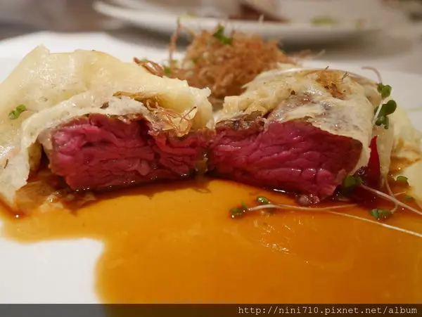 原來這層薄薄的是牛奶去煎的牛奶皮,薄薄嫩嫩的口感很細緻,妹妹說上頭的牛肉絲沙拉工法很厚工,是挺別緻的一道料理
