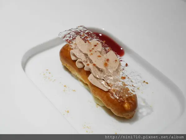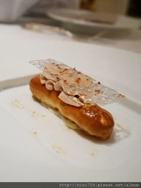 甜點之一閃電泡芙,來自義大利的藍紋乳酪填塞入泡芙裡,但其實處理的很好沒有大家怕的那個味還多了種獨有的香氣,上頭是濃郁的榛果奶油醬