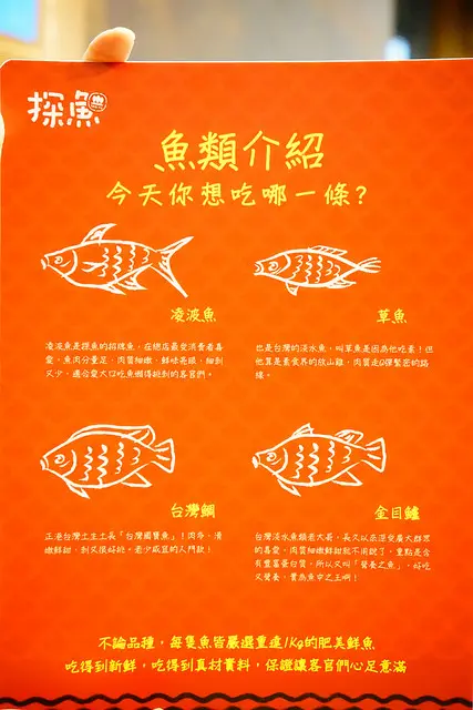 連魚的種類也可以選擇,這當然就關係到價位問題了,不過無論選擇哪種品種的魚,每隻魚皆會嚴選重達1kg的肥美鮮魚,喜歡Q彈細緻少魚刺的凌波魚,還是肉質扎實老少咸宜的台灣鯛,想吃好點的也可以選擇好甜好美的魚中之王金目鱸,這裡通通可以滿足你,最便宜的是台灣鯛950元一尾,凌波魚是1000元一尾,金目鱸是1300元一尾,其實跟我一樣怕魚腥味或者土味的一點都不用擔心,探魚的重口味都會掩蓋住我害怕的那些味