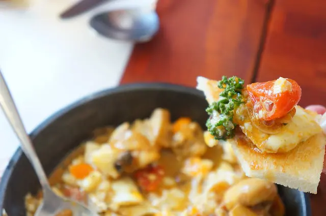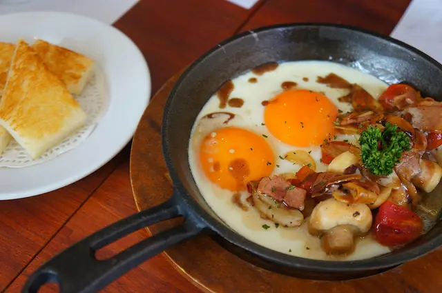 小鐵鍋松露烘蛋搭烤的酥酥熱熱的麵包,跟一般打散的烘蛋做法不太一樣,將兩顆土雞蛋整個放在鐵鍋裡,加入炒培根、蘑菇、蒜片與羊肚菌,最後淋上甘蔥紅酒牛肉醬汁與白松露奶泡,放入烤箱均勻烘烤成充滿奶油香的太陽蛋
