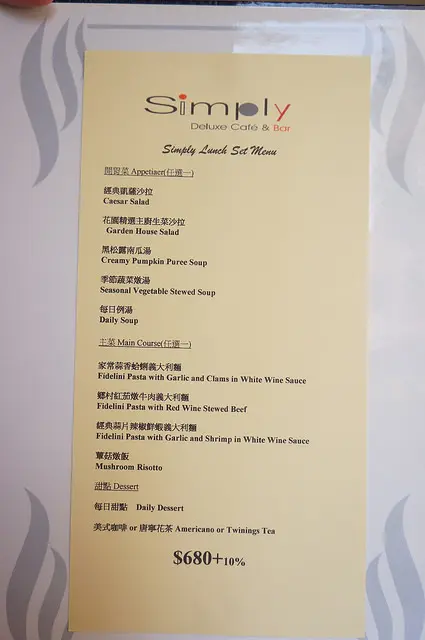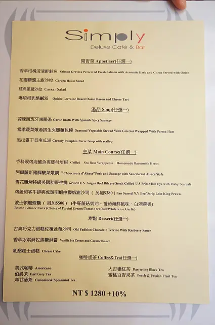 simply樸儷花園的菜色原本都是以單點的方式,但因為客人都會拿他們與法森的套餐式出菜來做比較,所以不得已只好也推出了套餐,有680元和1280元兩種套餐,已經習慣套餐模式的我們會覺得點套餐感覺比較划算些,像我就好不習慣歐洲的餐廳通通都是單點式的,每點一樣我就得偷偷觀察一下蟹老闆的臉色,但單點的好處是餐點的選擇上比較彈性,你可以選擇你想要吃的,各有各的好處
