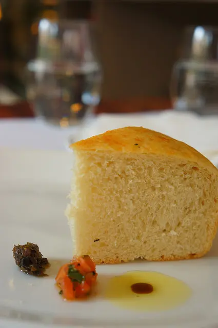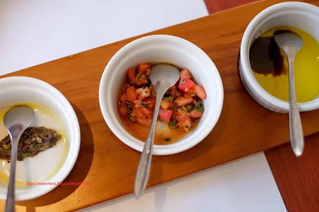 三種麵包沾醬,老酒醋加橄欖油、酸甜的蕃茄莎莎醬,還有黑橄欖加鯷魚帶著鹹味的沾醬,各有不同風味,我偏好酒醋橄欖油,喜歡橄欖油與香草的香氣瀰漫在嘴裡