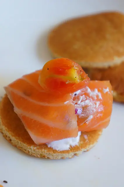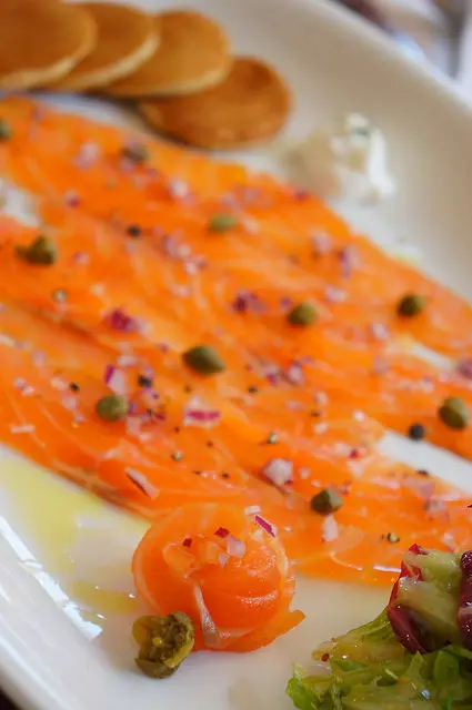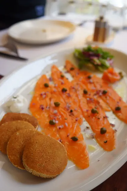 胡桃木淡燻鮭魚,自製的冷燻鮭魚以胡桃木慢火低溫煙燻八小時,淋上橄欖油的他看起來油油亮亮的真是可口