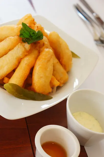 麵衣蓬鬆的感覺真的就像棉花糖般的溶化在嘴裡,沾一點特製的塔塔醬和麥芽醋,是口感極為優雅的炸物,本身已經很清爽的麵衣再配上麥芽醋更是清新無比,薯條搭麥芽醋味道也整個高級了起來