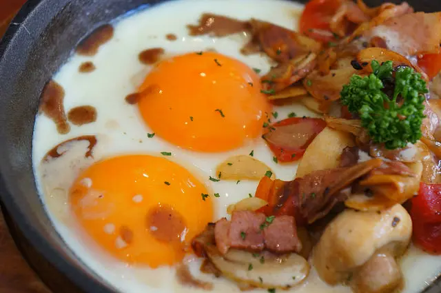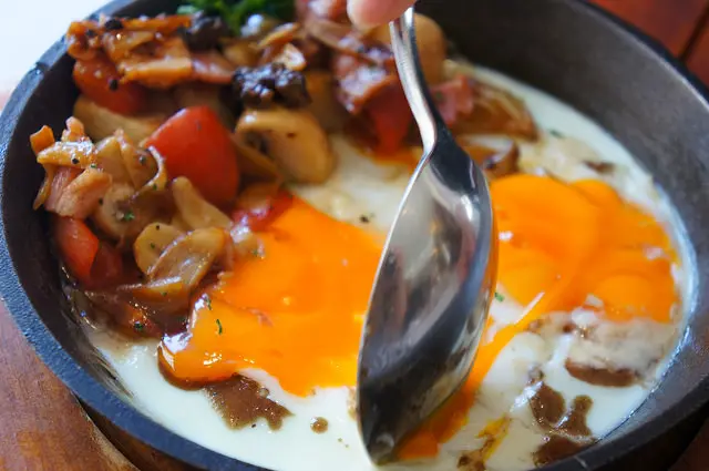 時將蛋黃劃破,半熟的蛋黃與軟嫩的蛋白與所有的食材混和拌炒猶如炒蛋般,此時會散發出培根與蒜片的香氣