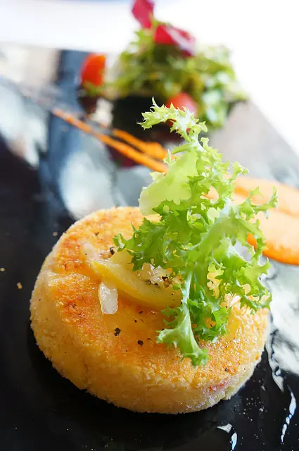 梭子蟹肉餅,飽滿甜美的梭子蟹肉與白酒拌炒,做成手工的蟹肉餅,蟹肉餅先酥煎後再烤過形成了外酥內軟的多層次口感,搭配甜椒醬與特製的油封檸檬,爽口鮮美
